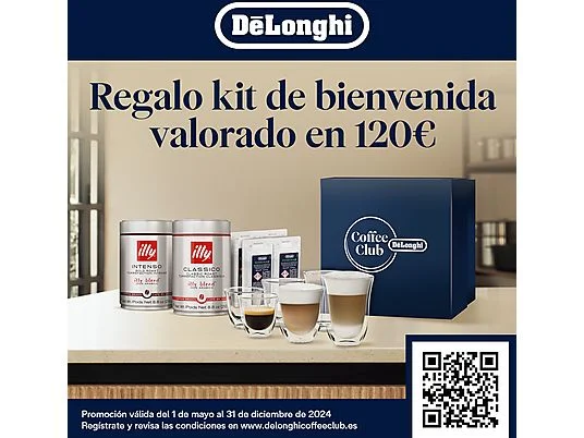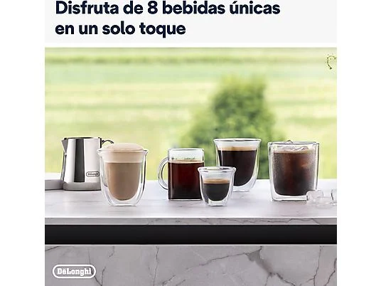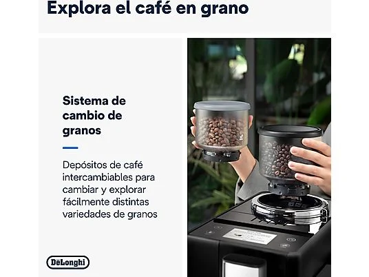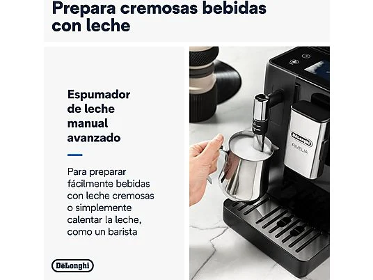 Sumérgete en el mundo del café con la cafetera superautomática Rivelia EXAM440.35.B de De’Longhi con molinillo integrado. Explora infinitas variedades de granos con el sistema Bean Switch y disfruta de una experiencia envolvente con una pantalla táctil a todo color de 3,5 pulgadas, con animaciones detalladas y rutinas de café adaptadas a ti. Prepara una espuma cremosa con el vaporizador de leche manual, en una máquina compacta que se adapta a tu estilo.