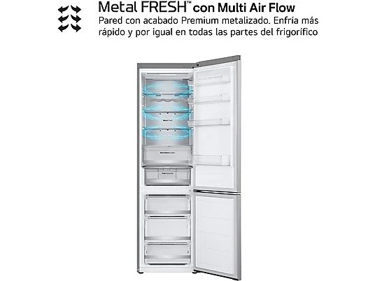 El aire frío fluye uniformemente a través de las rejillas de ventilación del frigorífico, lo que garantiza que el refrigerador se mantenga libre de escarcha y que los alimentos se mantengan frescos. Dado que no es necesario descongelar manualmente, su frigorífico siempre está listo para usar.