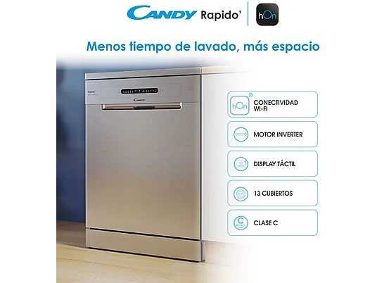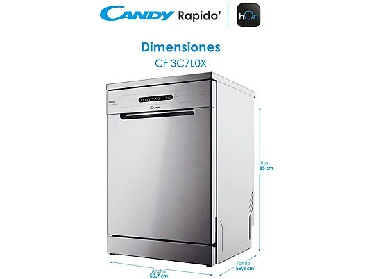 El lavavajillas Candy Rápido’ CF 3C7L0X, cuenta con 13 servicios y 5 de ellos de ciclos rápidos para cada necesidad. Además, cuenta con inicio diferido, para poder programarlo cuando llegues a casa y recogerlo. Todas las prestaciones centrándose en menos tiempo de lavado, más espacio de lavado y más comodidad para el hogar.